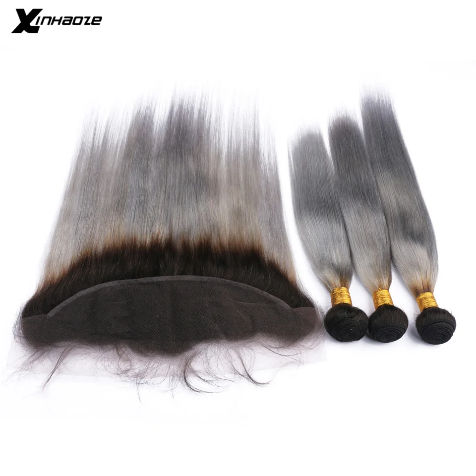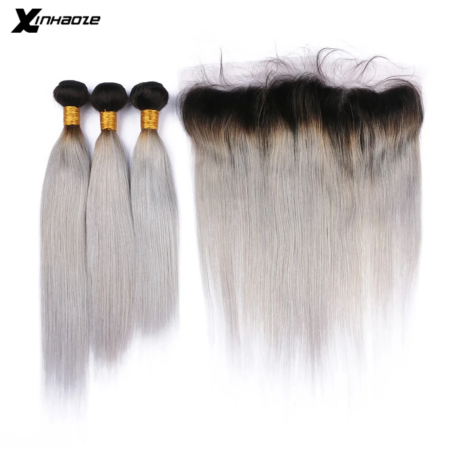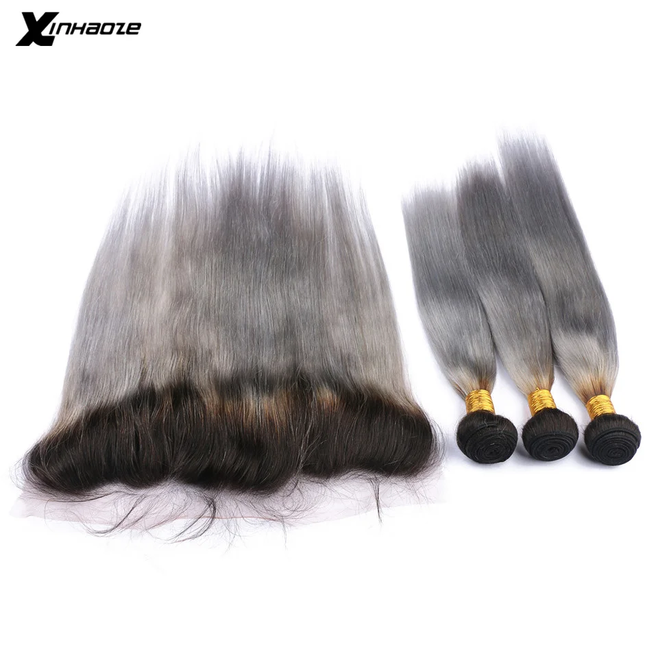 HIGH QUALITY Ombre 1B/Grey Brazilian Hair Straight Silver Gray Remy Human Hair 3 Bundles With Lace Frontal